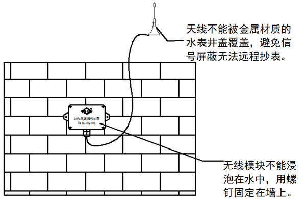 2. 模塊不能浸泡在水中,安裝時用螺釘固定在牢固墻面,引出天線不能被金屬材質(zhì)的水表井覆蓋,避免信號屏蔽無法遠(yuǎn)程抄表。